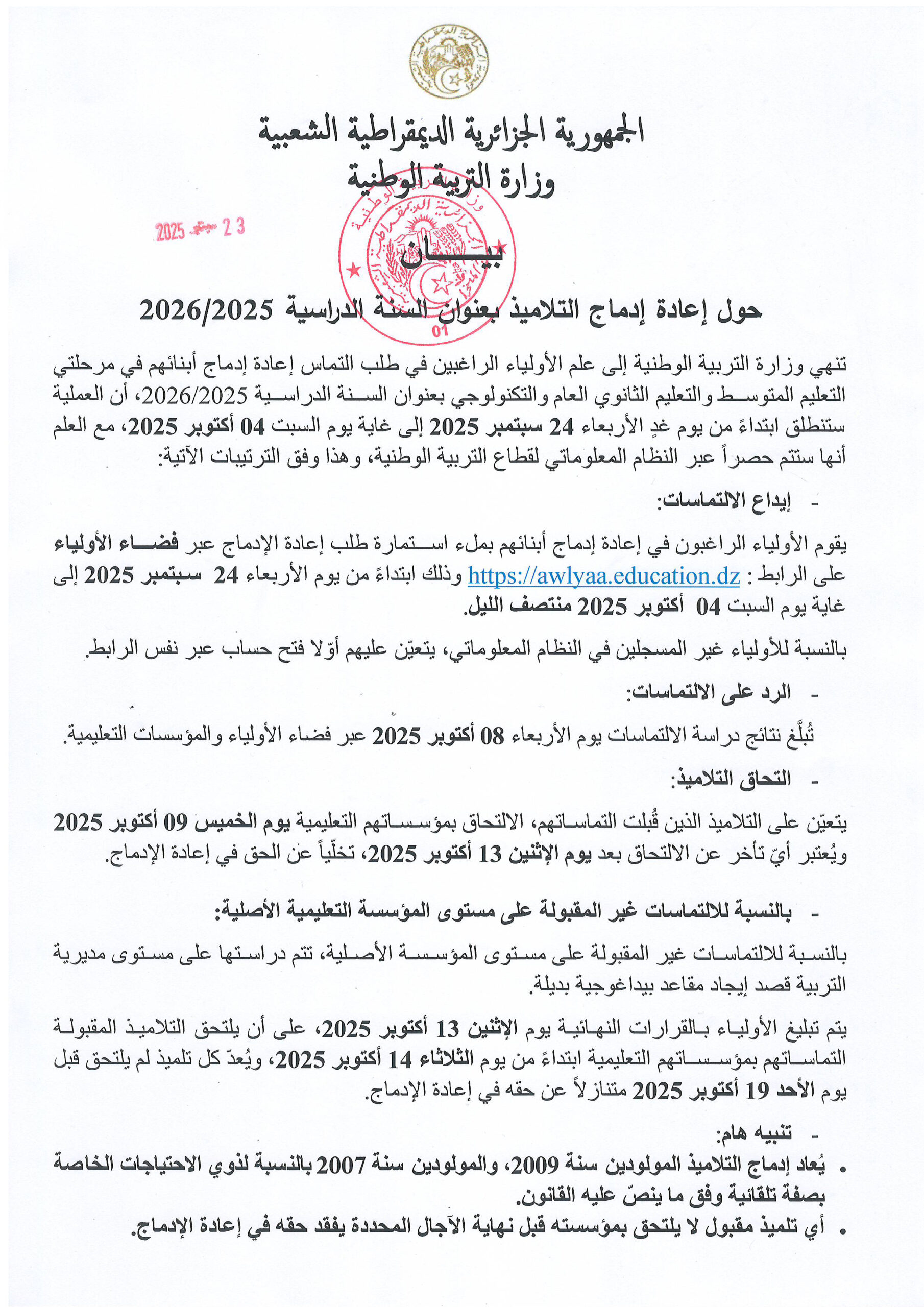 يتعين على التلاميذ الذين قبلت التماساتهم، الالتحاق بمؤسساتهم التعليمية يوم الخميس 09 أكتوبر 2025 ويُعتبر أي تأخر عن الالتحاق بعد يوم الإثنين 13 أكتوبر 2025، تخلياً عن الحق في إعادة الإدماج.