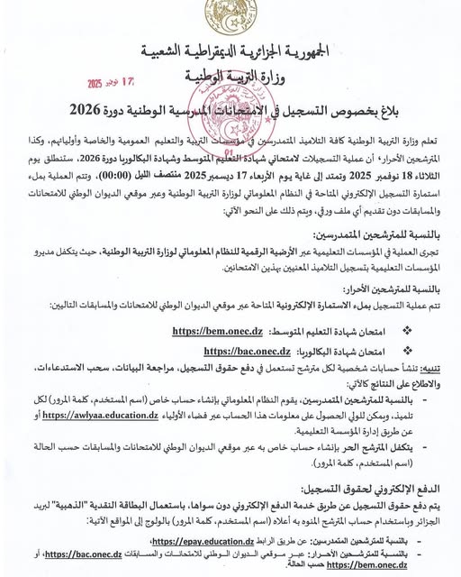 وتتم العملية بملء استمارة التسجيل الإلكتروني المتاحة في النظام المعلوماتي لوزارة التربية الوطنية وعبر موقعي الديوان الوطني للامتحانات والمسابقات دون تقديم أي ملف ورقي.